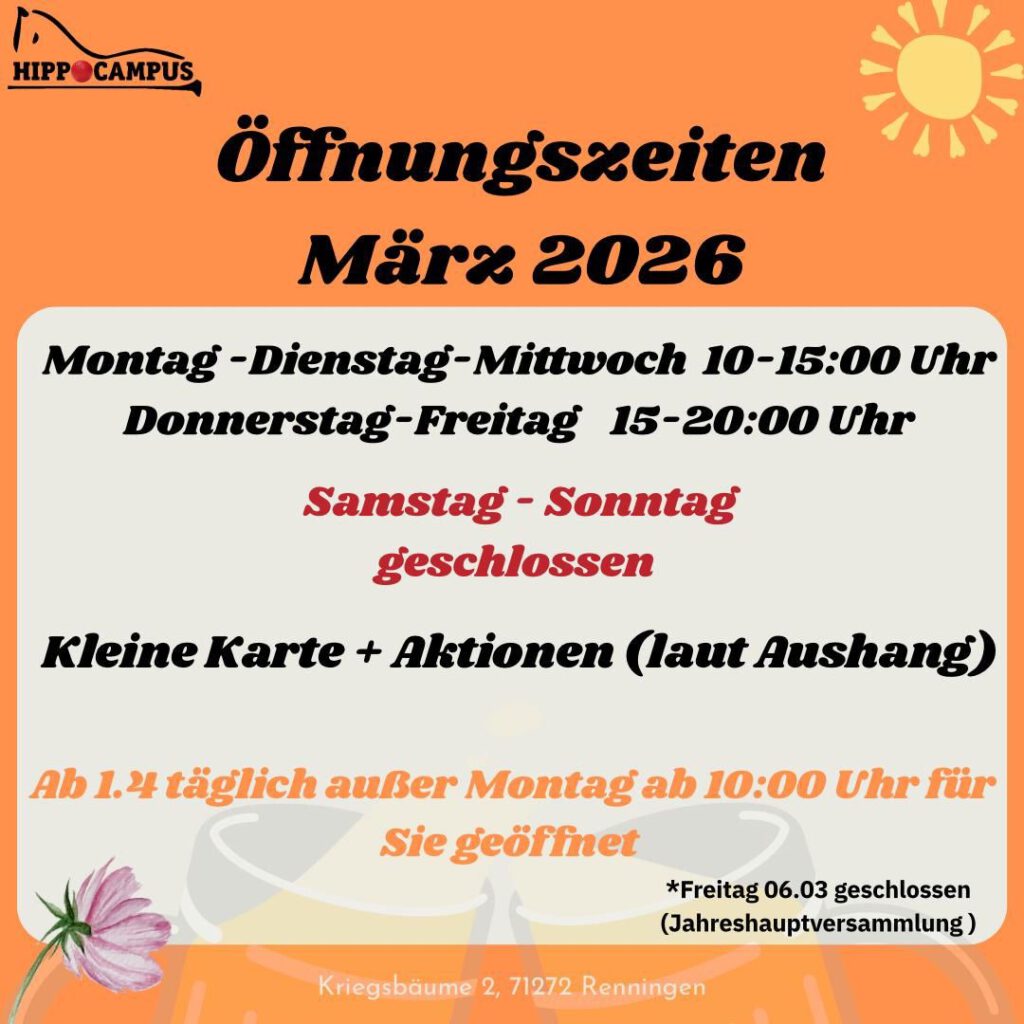 - von November bis März: Montag ist Ruhetag, Dienstag - Sonntag: ab 10:00 Uhr geöffnet. Andere Zeiten mit Absprache möglich unter 0174-74 20 20 6